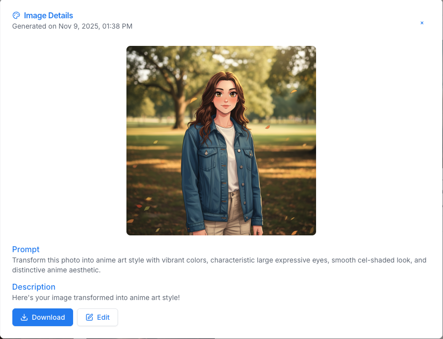 - Metadata: Prompts used, generation date, and settings